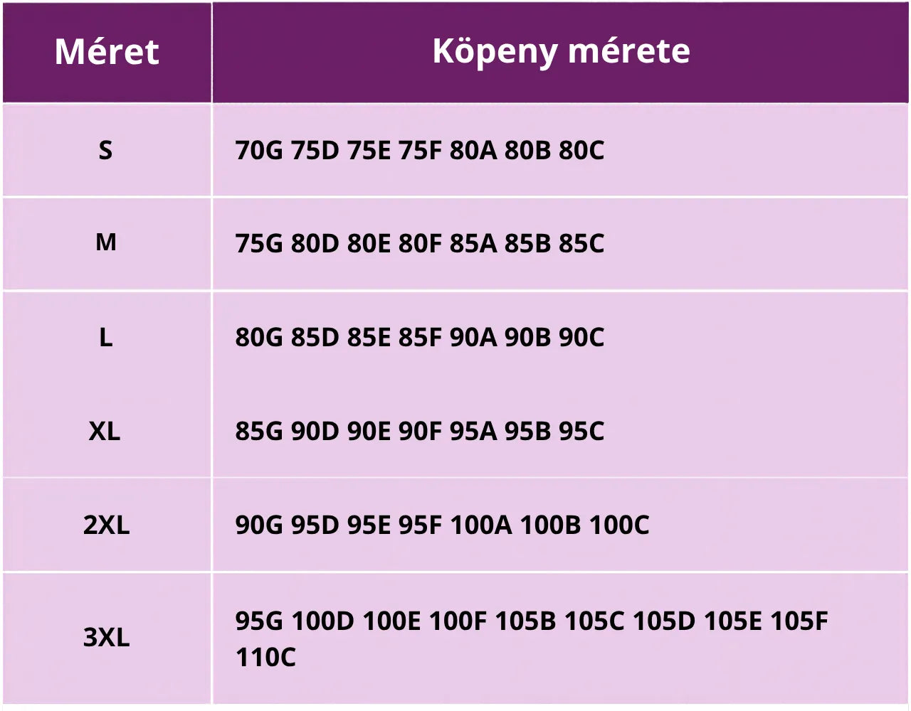| 3XL | 95G 100D 100E 100F 105B 105C 105D 105E 105F 110C |