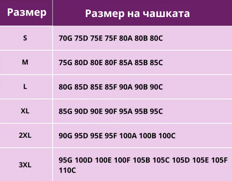 | 3XL | 95G 100D 100E 100F 105B 105C 105D 105E 105F 110C |
